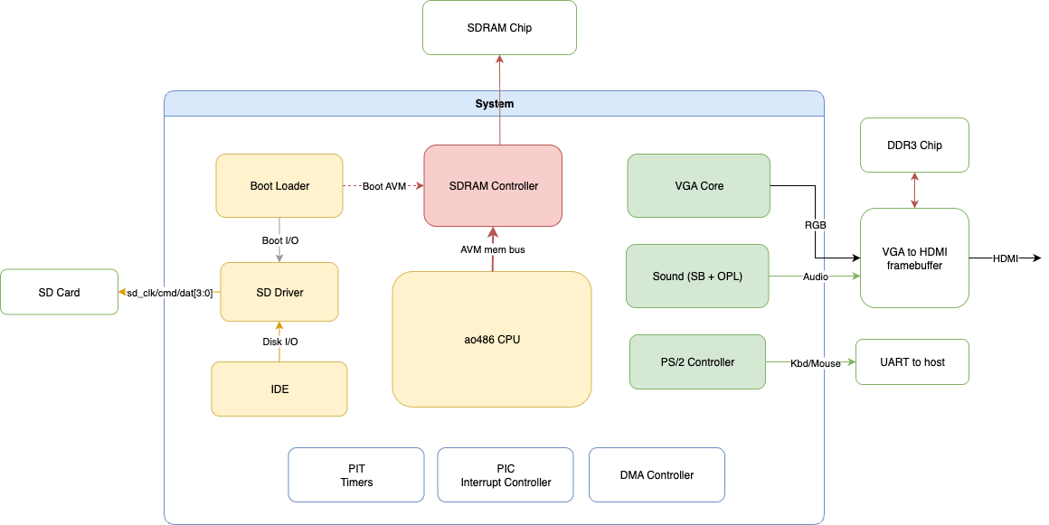 Every FPGA board is a little different. Porting a core means moving pieces around and rewiring things to fit. Here are the major components in 486Tang: