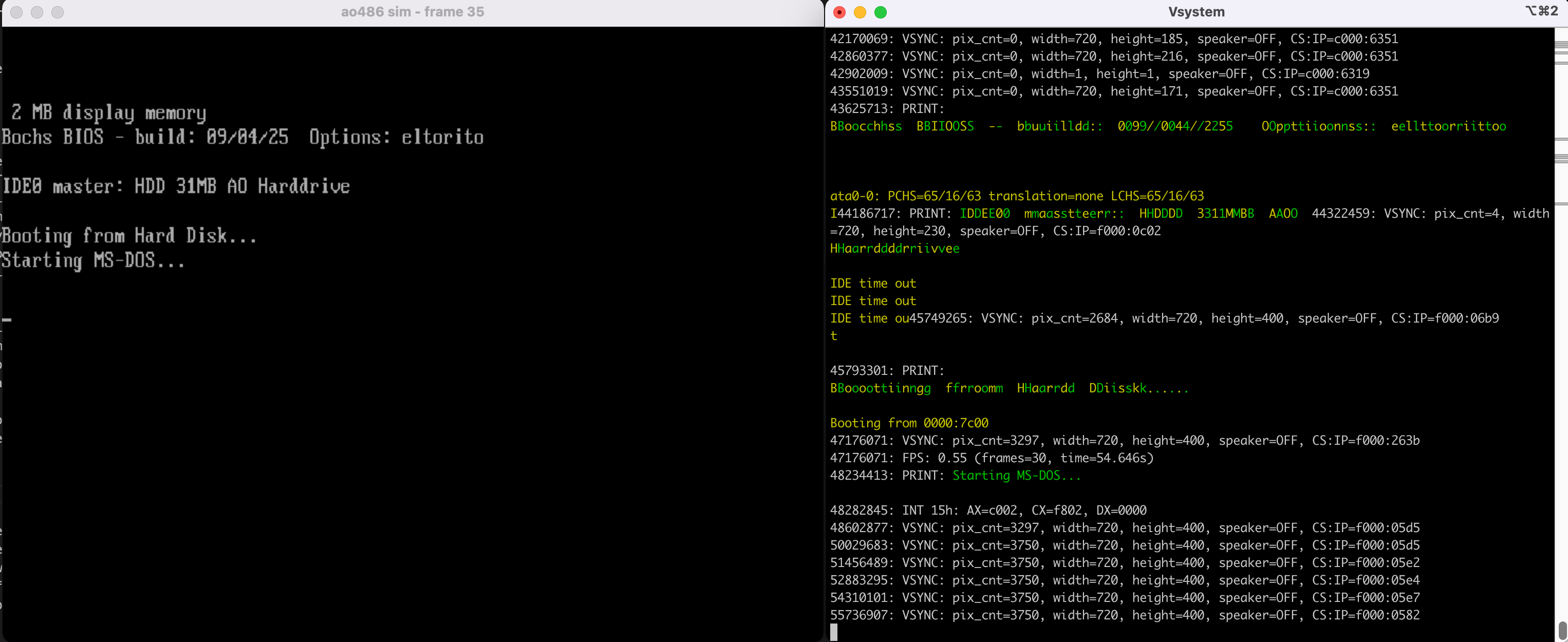 Here's a simulation session. On the left the simulated 486 screen. On the right is the simulator terminal output. You can see the green VGA output and yellow debug output, along with other events like INT 15h and video VSYNCs.